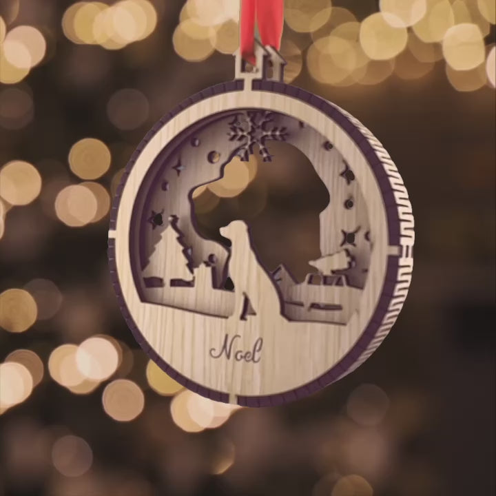 Celebrate your cherished dog this Christmas season with a beautifully detailed ornament. Made from three layers of finely laser-cut Basswood, Cherry, and Walnut, held together by a wooden kerf band, this ornament showcases expert American craftsmanship. Measuring 3.75" wide by 4.3" tall, it offers a perfect size to enhance your Christmas tree. Personalize it with free custom engraving to make it truly unique. Please handle with care, as the natural wood materials, while carefully crafted, are delicate and can break if dropped.