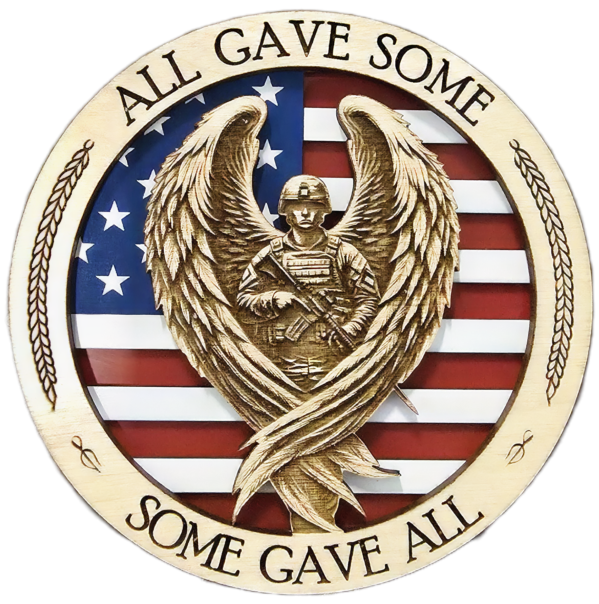 This powerful new Patriotic handcrafted wooden emblem features an American Soldier enveloped with wings — one of our national symbols of freedom, strength, courage, and independence — proudly displayed against the American flag.