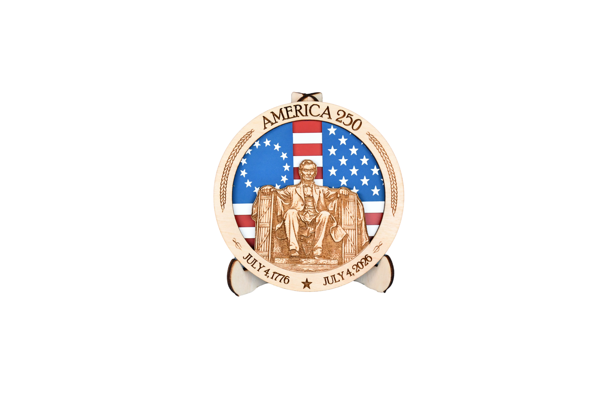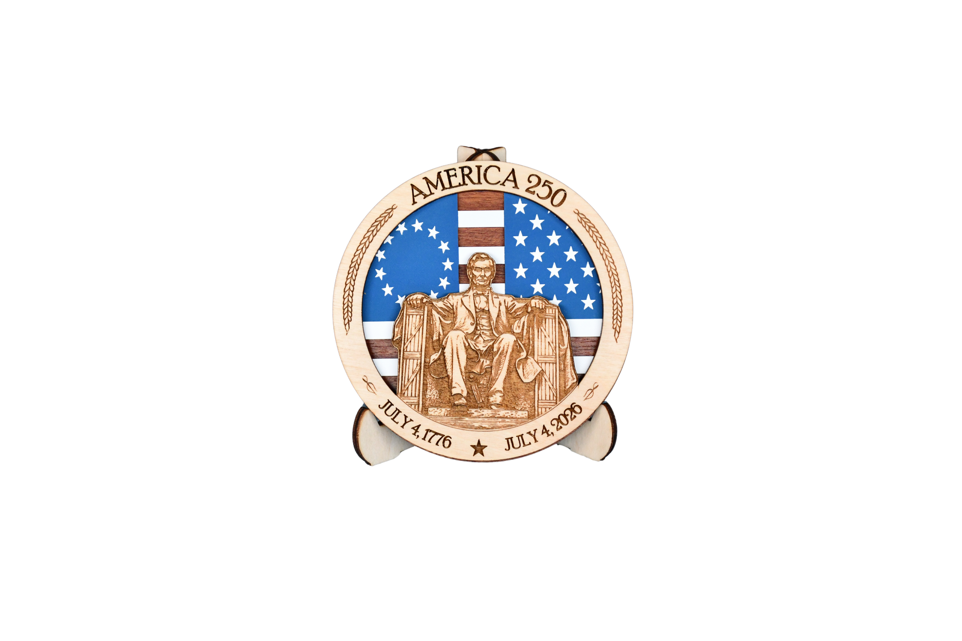 Celebrate America250 and your pride in our country with this American made, American designed product featuring a laser engraved rendering of the Lincoln Memorial! Measuring 4" in diameter, it's the perfect size for your home or office, making them ideal for year around display. Crafted from high quality White Birch front, acrylic stars and union, and either red acrylic or Sapele wood back, each piece is made to last. Show your patriotism with a thoughtfully made American product, an enduring alternative to mass produced, low quality, imported goods.
