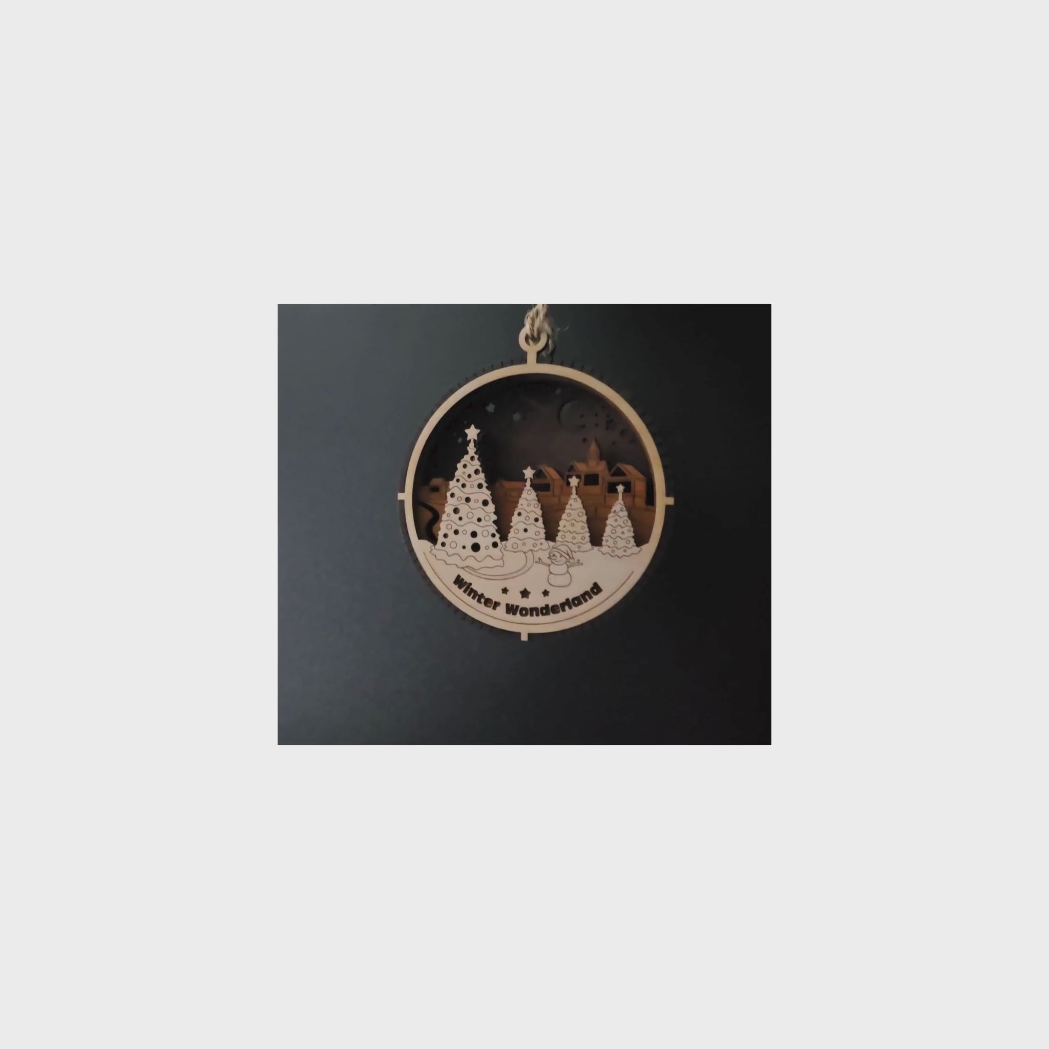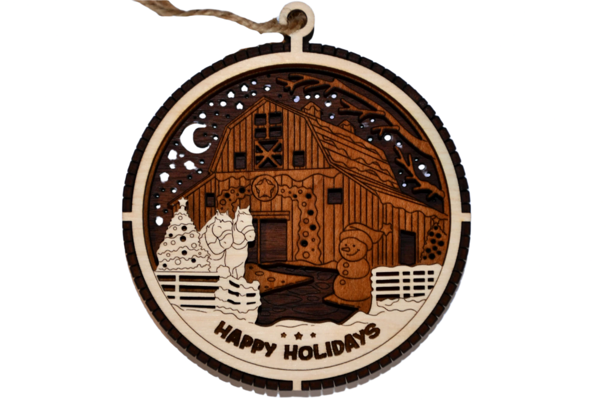 Behold this beautiful multi-layer ornament. The back layer reveals a beautiful background of stars and the moon. The mid layer reflects a snowman and country barn. The foreground displays Christmas tree, horses, and snow-covered fence.